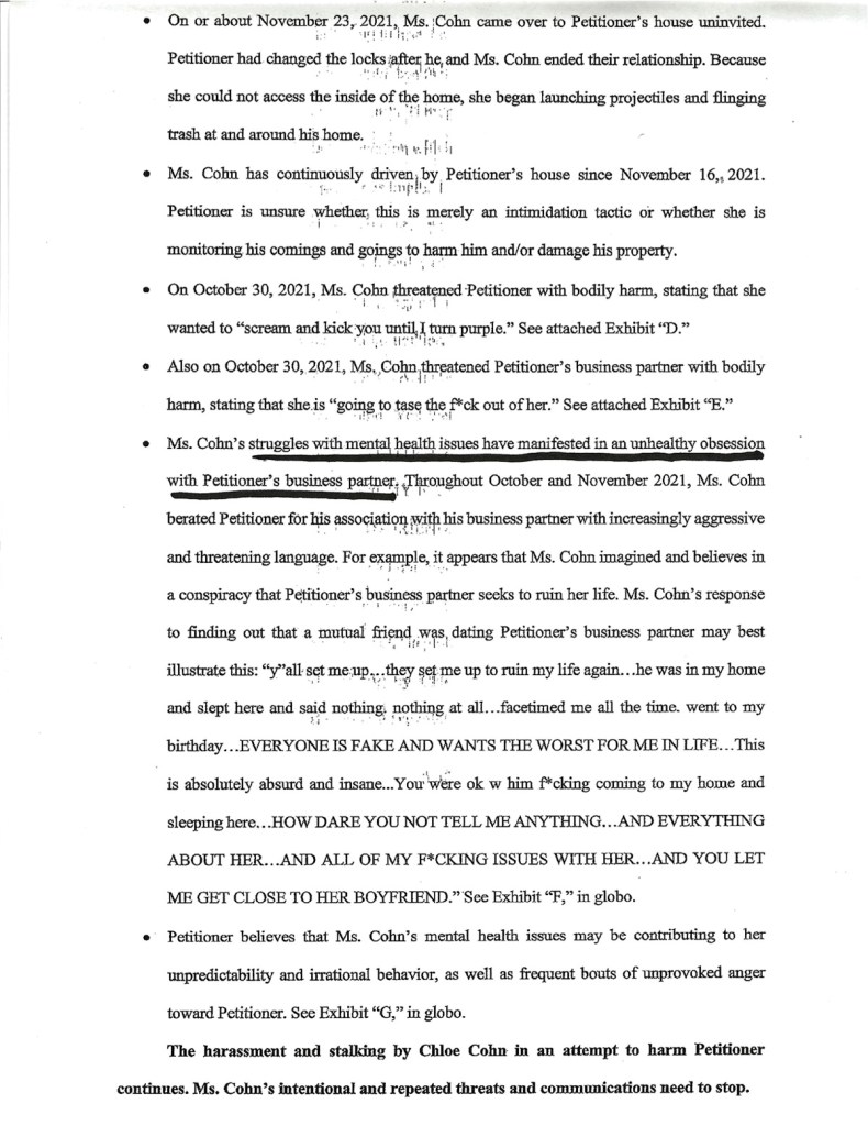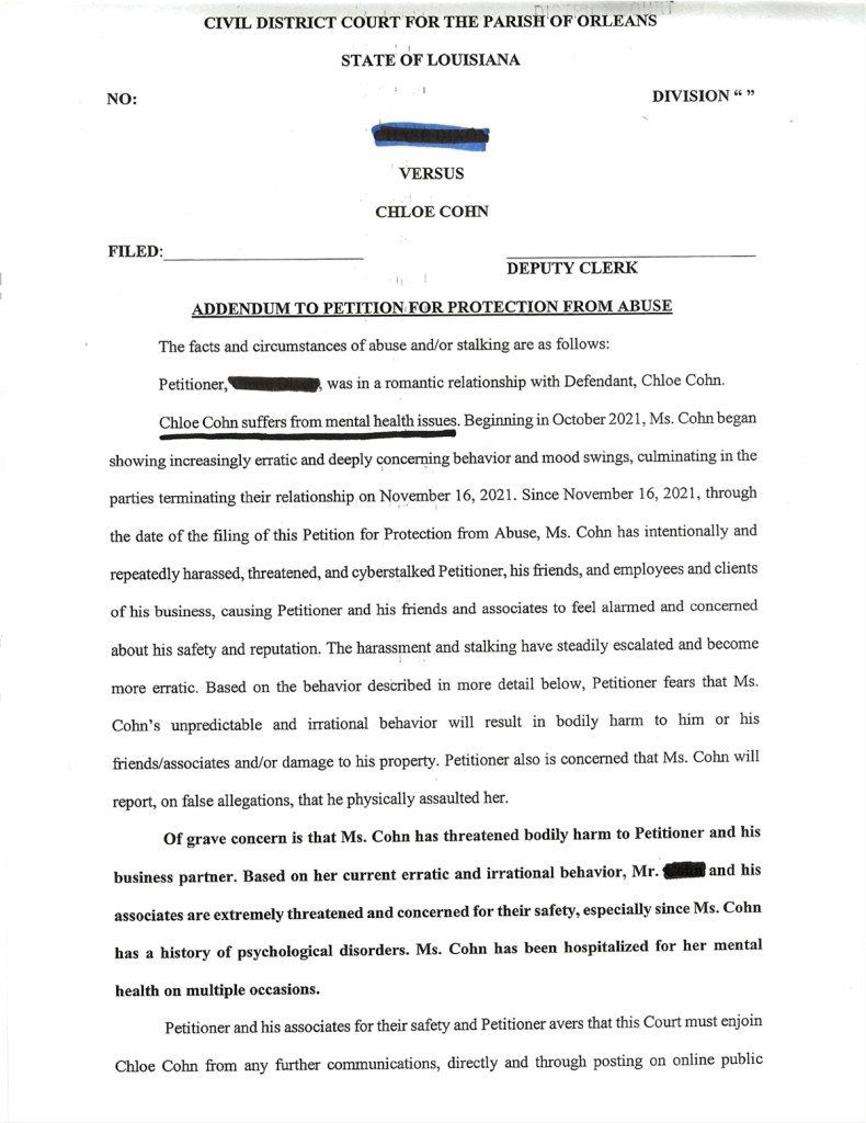 All files on this website are all public record, entered into Orleans Parish Civil District Court, Section K. Filed December 23, 2021. Petitioner: ***** ***** , DEFENDANT: CHLOE REESE COHN. Case No. 2021-10375