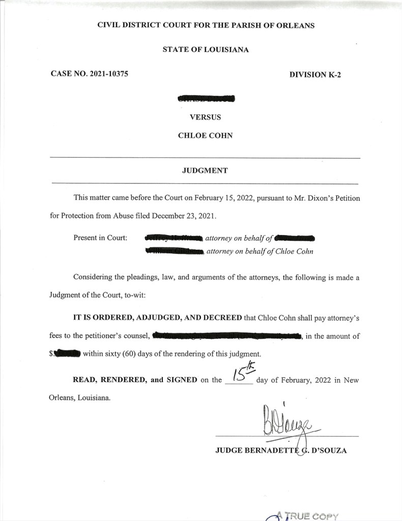All files on this website are all public record, entered into Orleans Parish Civil District Court, Section K. Filed December 23, 2021. Petitioner: ***** ***** , DEFENDANT: CHLOE REESE COHN. Case No. 2021-10375